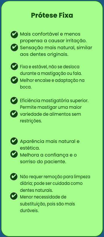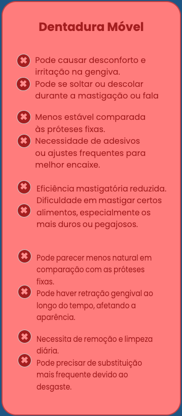 Pare de utilizar dentaduras que ficam incomodando, machucando e até mesmo tirando o seu paladar! Troque sua dentadura por uma prótese fixa agora mesmo. Conheça as vantagens: